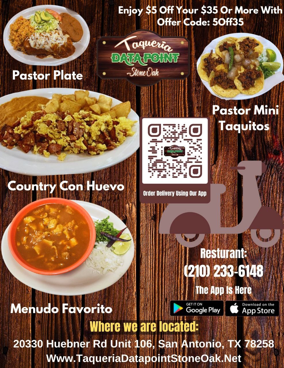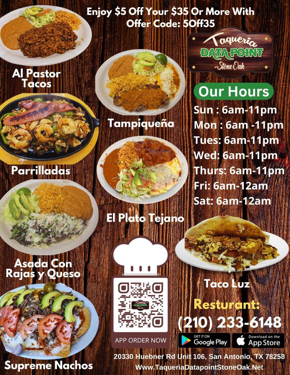 Taqueria Datapoint Stone Oak is more than just a restaurant; it's a celebration of Mexican culture and cuisine. Founded by a family with a deep love for cooking, our mission is to share the authentic taste of Mexico with the local community. Our passion for food and hospitality runs deep, and we look forward to welcoming you!